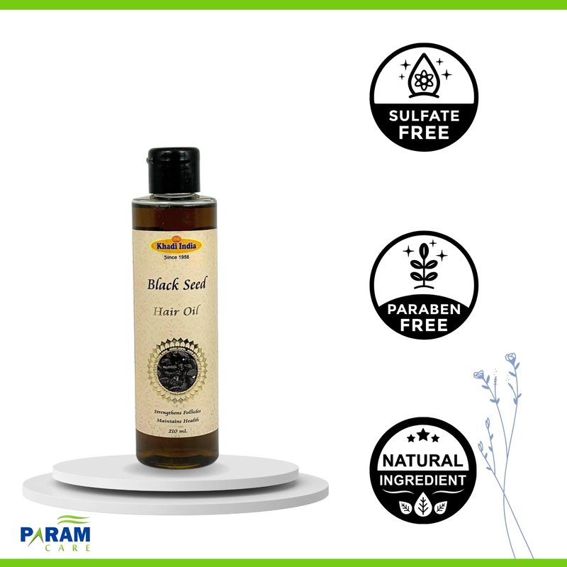 Indulge in the Ancient Power of Black Seed Oil Khadi India Black Seed Hair Oil harnesses the age-old wisdom of Ayurveda to deliver a natural solution for your hair and skin care routine. This oil, derived from the seeds of the Nigella Sativa plant, is renowned for its rich concentration of: Essential Fatty Acids: These fatty acids help nourish and strengthen hair strands, promoting a healthy scalp environment. Vitamins: A natural source of vitamins, Black Seed Oil helps support overall hair and skin health. Antioxidants: These antioxidants may help protect hair and skin from environmental damage.n