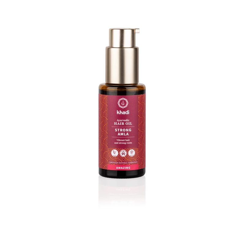 khadi Strong Amla Ayurvedic Scalp and Hair Oil - for healthy, strong and shiny hair from root to tip. Strong Amla nourishes your roots with vital nutrients and strengthens them for a long-lasting effect. Feel how the khadi hair oil gently coats every single strand of hair and strengthens your hair from within. Enjoy the deep conditioning experience and enjoy lush, strong hair, because a healthy scalp and strong roots are essential for beautiful hair. The secret of khadi Strong Amla Scalp and Hair Oil is the magical power of the khadi elixir: selected Indian medicinal plants are traditionally boiled down gently over an open fire according to millennia-old Ayurvedic recipes. This herbal extract, rich in active ingredients, strengthens the hair roots and hair structure. Ayurvedic medicinal plants such as Amla and Brahmi are also used to prevent premature graying: melanin production is stimulated and the hair maintains its natural color. Do you have normal hair and want more strength and volume? Do you want to keep your natural hair color for as long as possible? Would you like to have strong roots and vibrant, shiny hair? Then Strong Amla is perfect for you! Did you know that in Ayurveda, scalp and hair oil has been used for millennia as a deep conditioning hair treatment? Hair oil builds the hair from within. So the hair not only "seems" to be healthy, it shows its natural beauty and healthy strength.