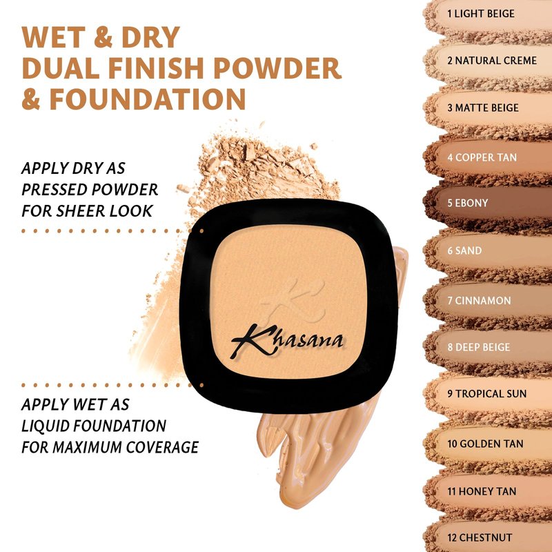 - ALL DAY COVERAGE OR LIGHT TOUCHUPS: Khasana Dual Wet and Dry Foundation can be applied wet as a base foundation, or dry for a lighter finish & touchups during the day. Your skin will look matte and beautiful all day.