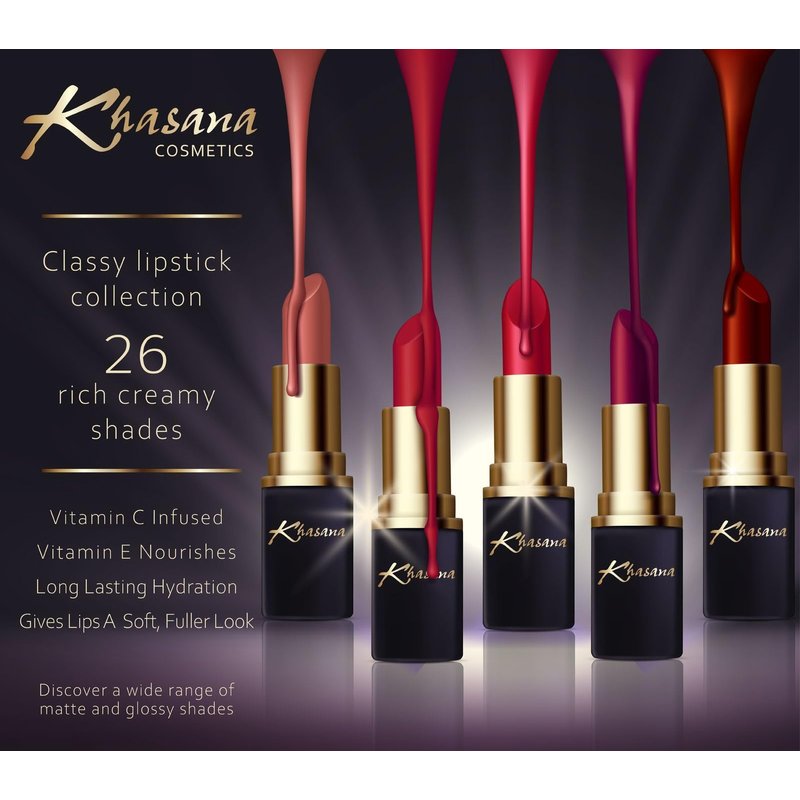 - TRENDY SHADES & ALL LIPS TYPES: Paint your smile with our vibrant, bright, and on-trend collection colors. Khasana Classy lipsticks, with their elegant and classic design, are resistant, hydrating, creamy, matte, moisturizing, gives a natural effect of full lips.