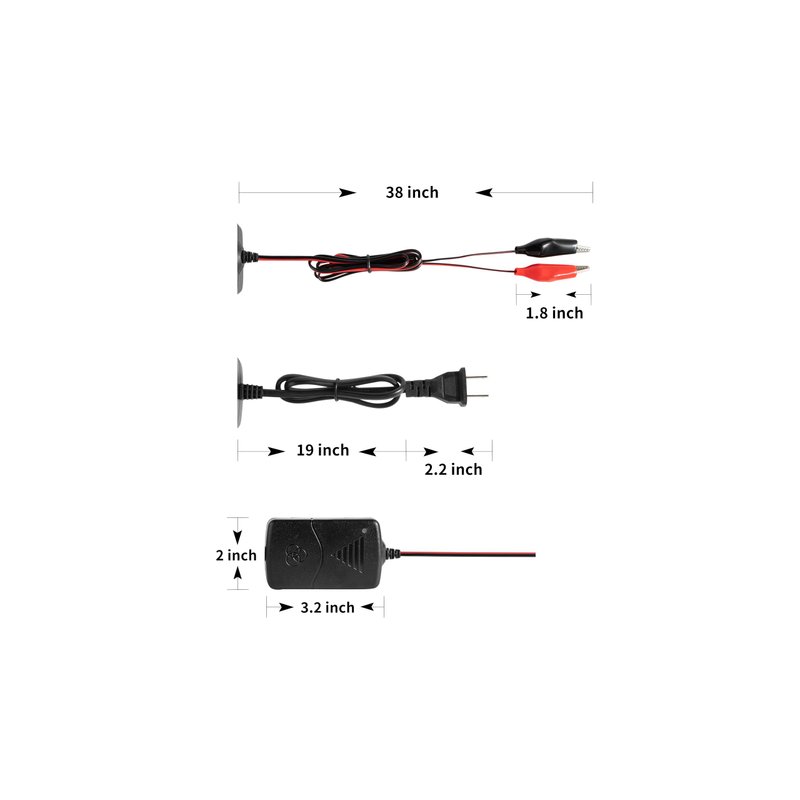 A leading automotive parts brand dedicated to providing high-quality, reliable, and innovative solutions for your vehicle. Introducing our car battery charger, the perfect solution for keeping your vehicle's battery in top condition. This powerful and versatile charger is designed to charge and maintain 12V lead-acid batteries, including those found in cars, motorcycles, boats, riding mowers, ATVs, and more. With its advanced smart charging technology, this charger provides a 3-stage charging process that is safe and efficient for your battery. The first stage is a slow charge, which is ideal for maintaining your battery's charge and preventing overcharging. The second stage is a fast charge, which can quickly restore your battery's power when it's low. The third stage is a maintenance charge, which keeps your battery fully charged and ready for use. Note: Only for 12V Sealed Lead Acid (SLA) Battery!!! Do not use this charger on other battery. Parameter: Input voltage: 110V-240V AC 50/60 HZ Output voltage: 14.2-14.8V suit for 12V car and motorcycle battery Output current: 1000mA Short Circuit Protection Multi Colored LED display for status indication Red Led on when charging Green Led on when fully charged Size(L*W*H): 15.2X10.3X4.1cm/ 6"x4"x1.6" (approx) Power Wire length: 60 cm Wire length: 100 cm Red clip connects to positive, Black clip connects to negative.