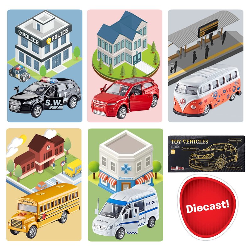 - DIE CAST TOY CAR: Set of 5 die cast vehicles, about 1:64 scale. New package is 9.4 x 4.2 x 1.7 inches, cars’ approximate size stays the same as 3.2 x 1 x 1.3 inches