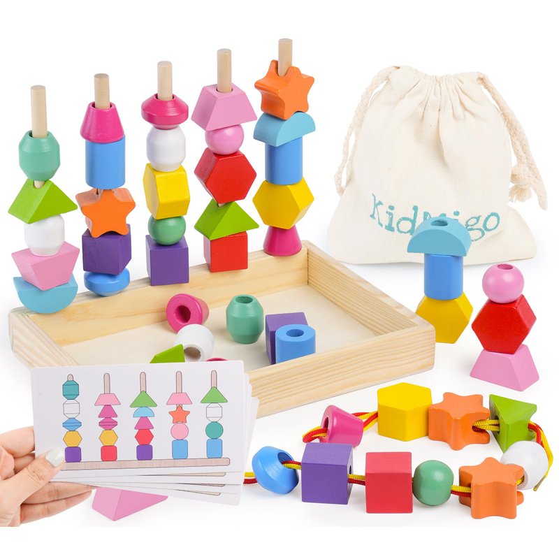 KidMigo Montessori Toys for 3 Year Old, Stacking Toys for Toddlers, Stacking Blocks, Lacing Beads, Matching Shape Preschool Toys, Montessori Toys for 3 4 5 Year Olds with Canvas Storage Bag