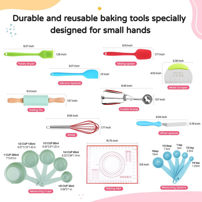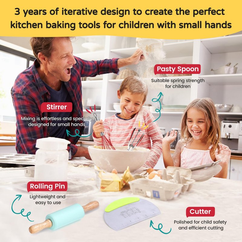 - Highly Educational: Parents are the best teachers. This kids baking sets introduces the basic knowledge of the kitchen to children in a mischievous way, providing conditions for children to imitate adult behaviors. Through baking practice, it enhances children's hand-eye coordination ability and cultivates good living habits. It is a hands-on approach to stimulating creativity and confidence! A necessary item for preschool activities!