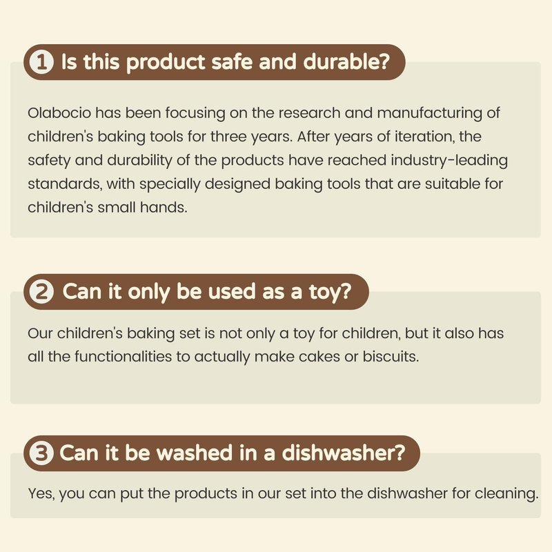 - Safety and Child-Friendliness: All the toddler kitchen tools in the Olabocio 12-piece kids baking set are non-toxic and food-grade, free of Bisphenol A (BPA), and dishwasher-safe. Through years of iterative design, the size and design of all the accessories are tailor-made for children. They are safe and effortless to use, with fine workmanship, and are not prone to breaking or deformation, ensuring that children have a safe and pleasant baking time.