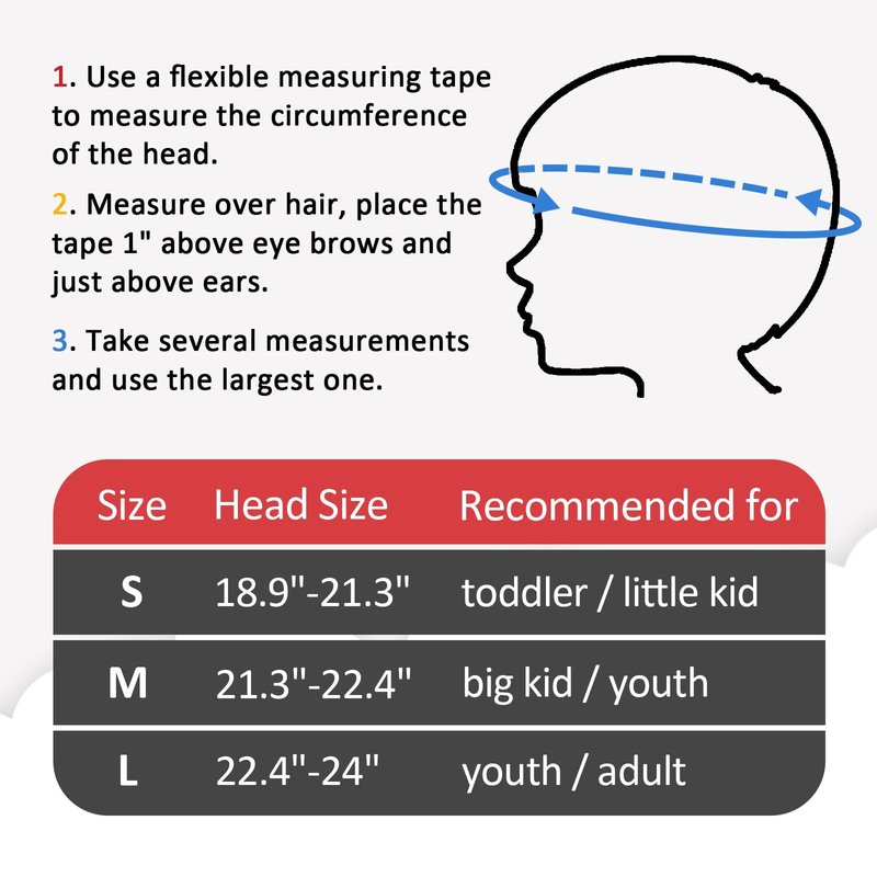 - 3 sizes available. Small: 18.9"-21.3" (48-54 cm), suitable for kids 2-8 years old. Medium: 21.3"-22.4" (54-57 cm), suitable for youth 8-14 years old. Large: 22.4"-24" (57-61 cm), suitable for people aged above 14.