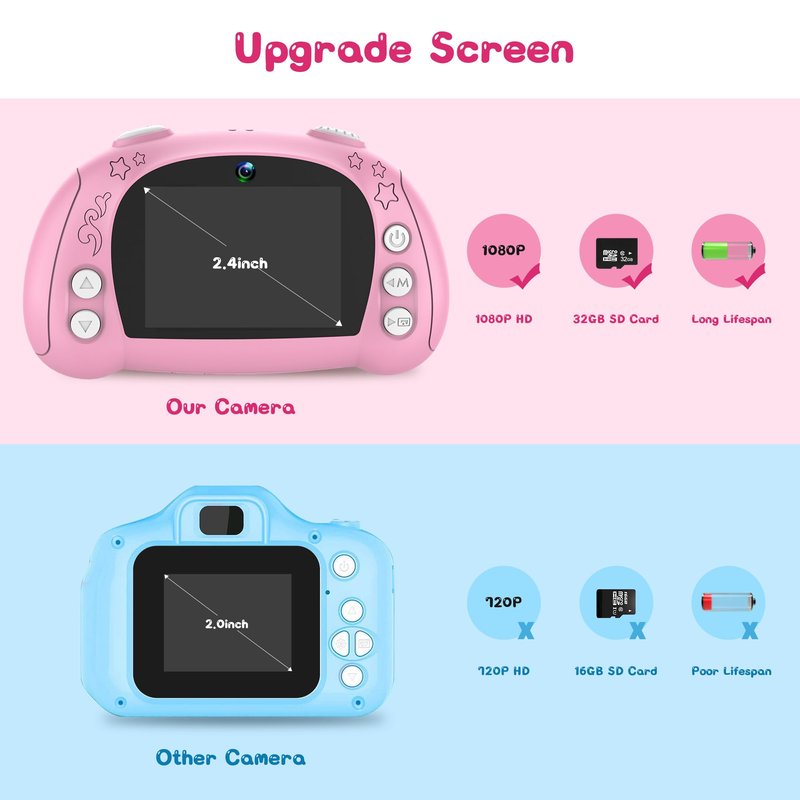 - Upgraded Toddler Camera: With a large 2.4-inch screen to provide a wider picture, reduce eye fatigue, and make the viewing more comfortable. 3 puzzle games help to keep kids entertained in their spare time.