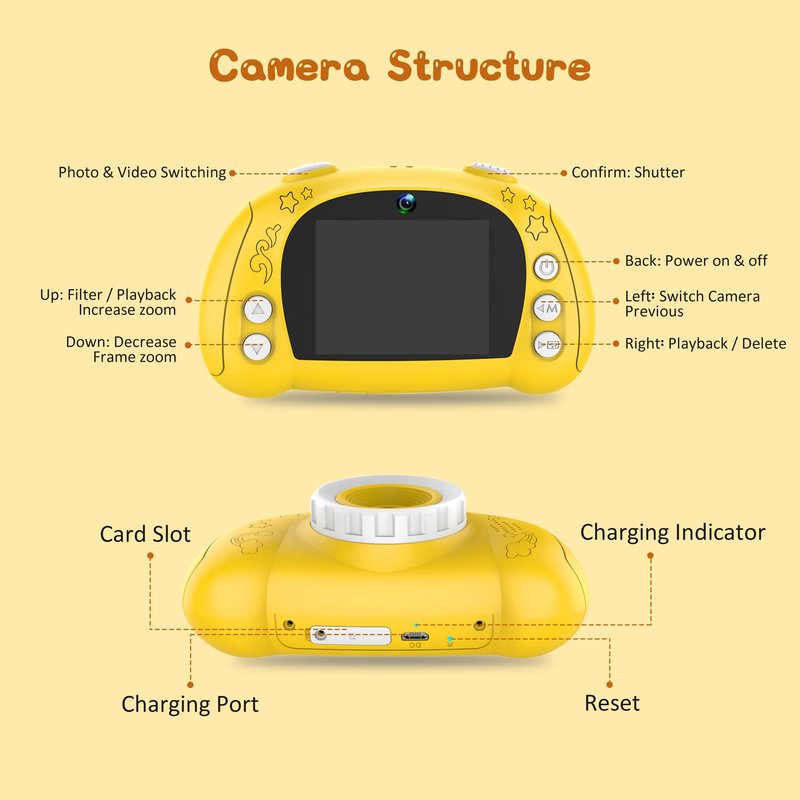 - Mini-Kids Camera: 4.5 "L x 1.4 "W x 1.7 "H kids digital camera, very lightweight and small to carry on. Perfectly fits your child's small hands, making it more convenient and easy for them to take selfies or videos.