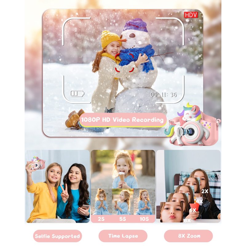 - New Upgrade Kids Camera & Gifts for Kids: Equipped with camera 2-inch super IPS screen 20 million pixels HD lens, 8x digital zoom, 28 frames and 6 filters, 15 different built-in frame photo effects, Let children experience the fun of multiple take modes. Our children camera is one of the great birthday and Christmas gift.