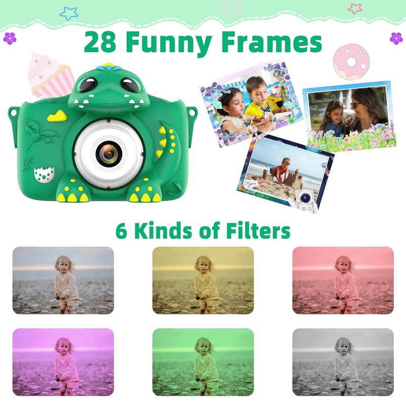 - Explore More Fun: Kids camera supports 12 languages, including 28 cute photo frames, 6 filters and 5 deforming mirror effects. The children's toy camera is equipped with 3 games of pushing boxes, eating snakes
