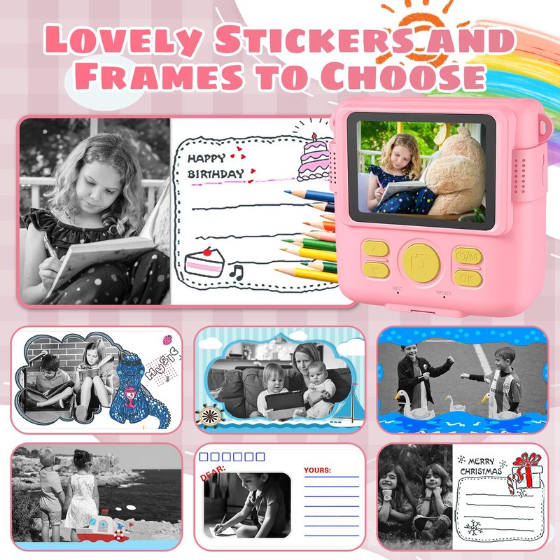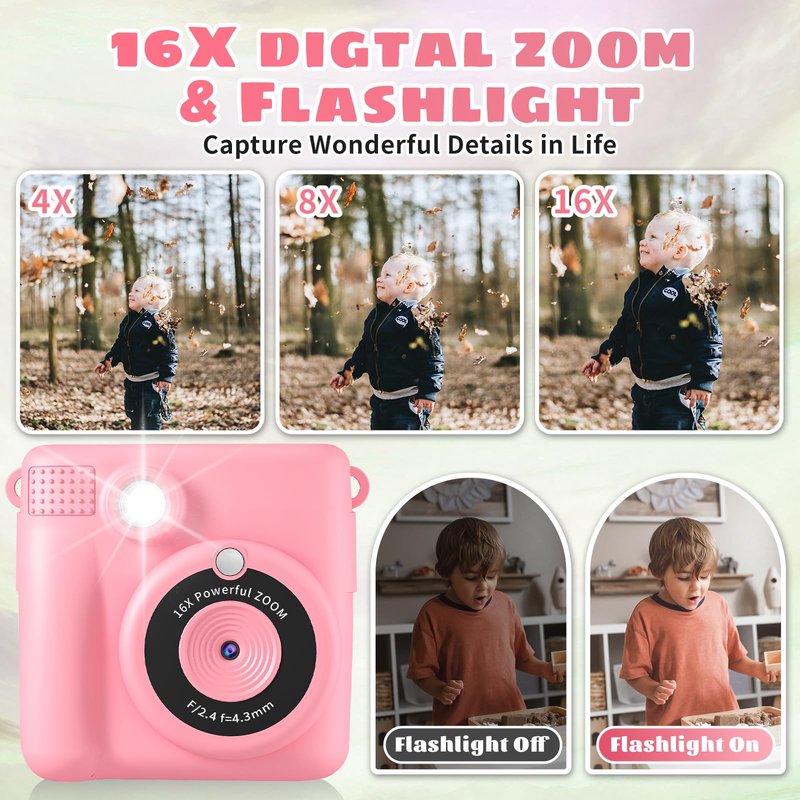 - 📷【Multifunctional Printed Camera】Children's camera not only supports 24MP original shooting, 1080P video recording and playback,but also has burst shooting, time-lapse photos,16x magnification zoom,8 mirror effects,18 photo frames, 5 filters and a music player, 4 puzzle games ect. Help kids capture beautiful moments & become life writers.