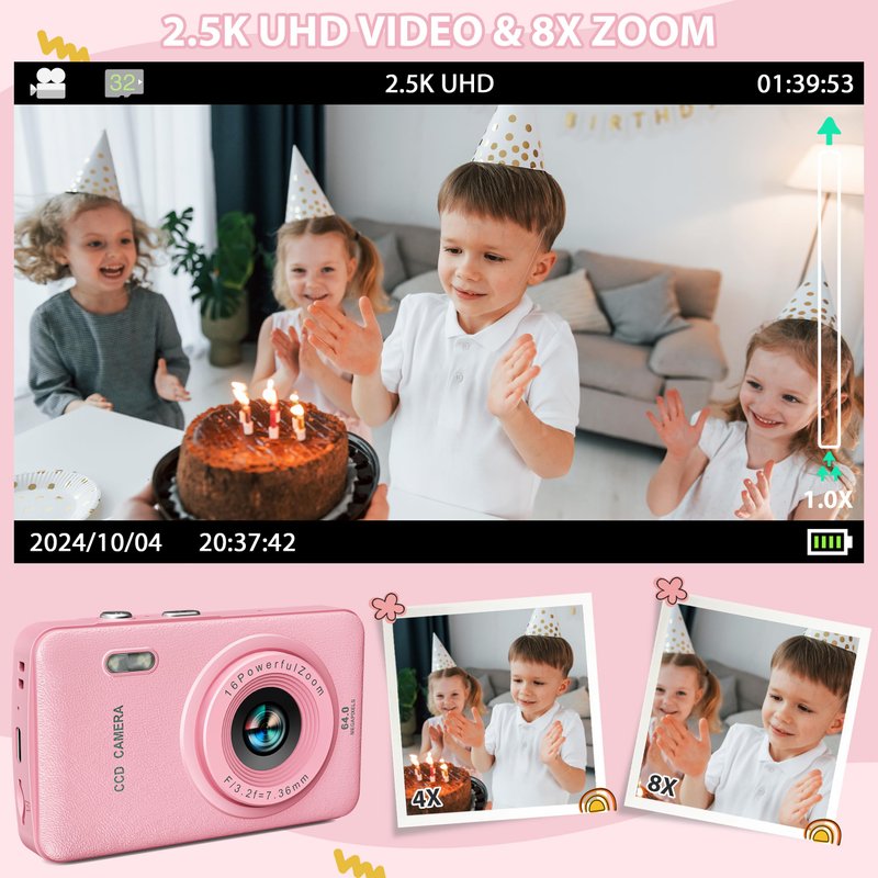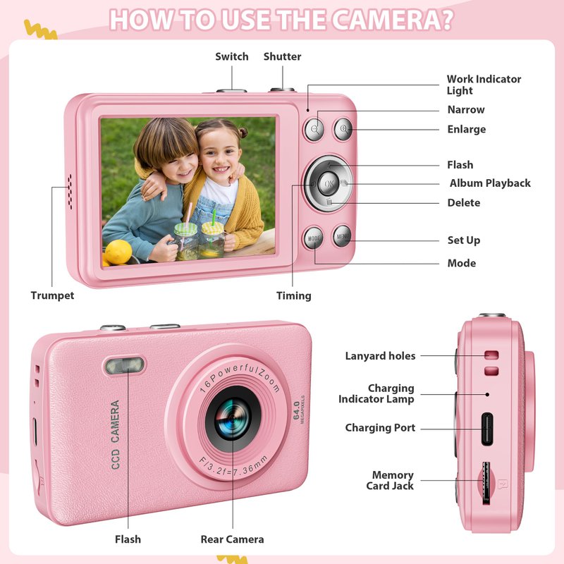 - Kids Digital Cameras: It comes with:1x Kids Digital Camera, 1x USB Charging Cable, 1x 32GB SD Card, 1x Card Reader, 1x TYPE-C Adapter, 1x Hanging Lanyard, 1x User Manual. In addition, the camera is equipped with a 2.8-inch screen, 100w pixels and 16x digital zoom, which better helps kids' photographer's dream!