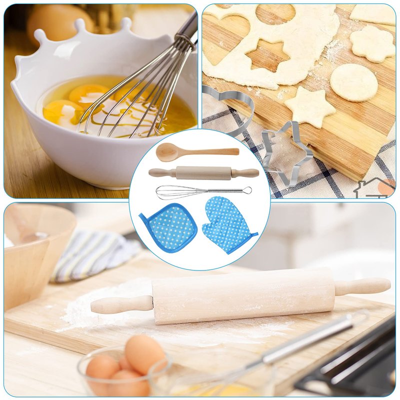 - đ°ăFully Functional Kids Cooking ToolsăUsing the whisk and spoon to stir food, use the mini roller and molds to make cookies and dough, use the oven mitt which is filled with PP cotton to prevent scalding. These kids cooking set for boys girls are the necessities of be able to play baker and chef. Perfect for the baker easy bake in home or kindergarten.