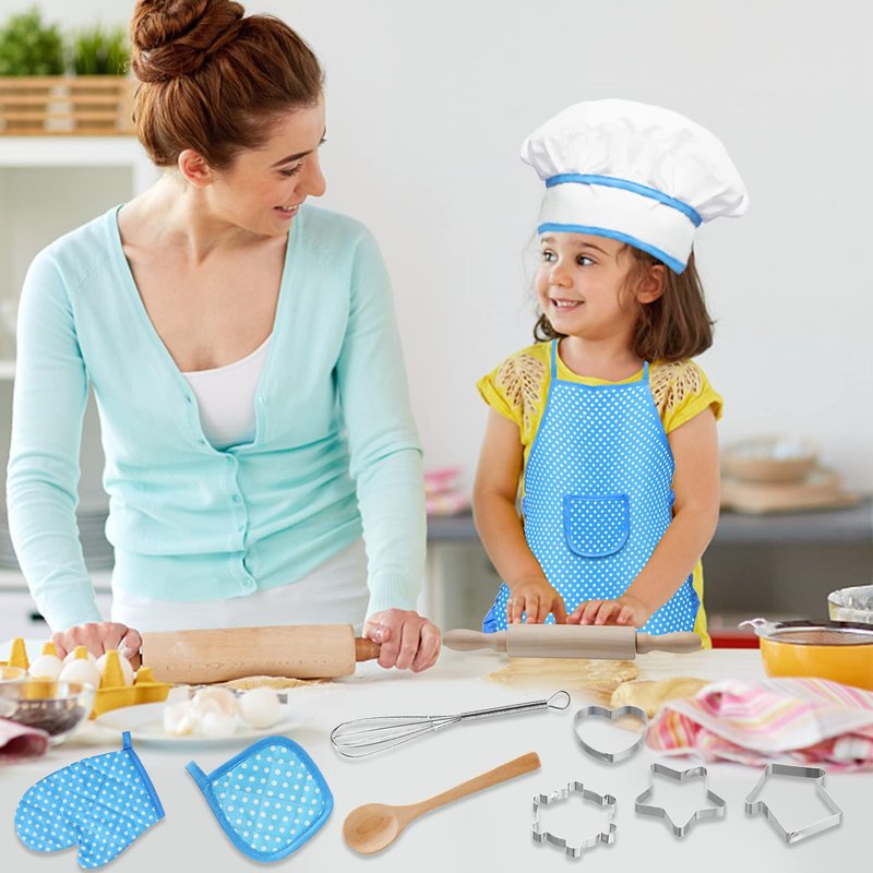 - đ°ăKids Chef Costume SetăYou will get kids aprons for cooking, toddler chef hat, wooden spoon, oven mitt, heat resistant mat, whisk, rolling pin, 4 cookie cutters. These kids baking set can meet most of the needs of the preschool girl & boy baking game. Giving your little one to start their adventures in the kitchen.