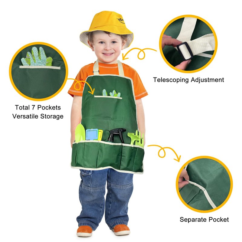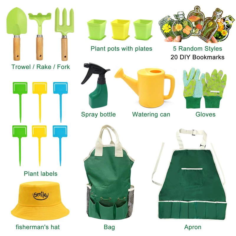 - š±ćPackage Included ćComes with everything your child needs to explore the joys of gardening! This comprehensive set includes a wooden handle alloy rake, fork, trowel, watering can, gloves, apron, tote bag, plant pots, and DIY bookmark kits
