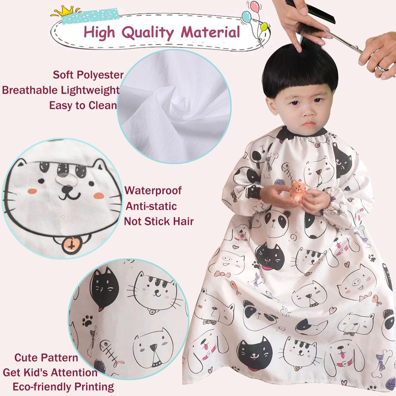 - HIGH QUALITY MATERIAL: Our kids hair cutting cape is made from water-repellent polyester fabric, anti-wrinkle and anti-static, do not stick hair, breathable and lightweight, durable and reusable, easy to clean and machine washable.