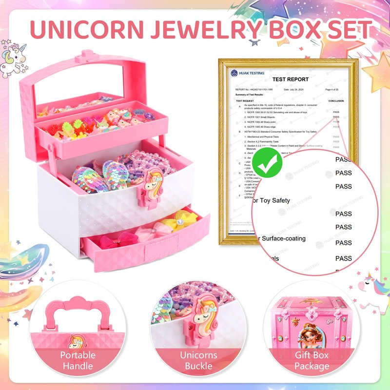 - PRINCESS JEWELRY BOX: Exquisite three-layer unicorn toys for girls age 4-6, the design of the girls jewelry box is portable and durable, so your gifts for girls ages 3-8 is guaranteed to last for long time, each toddler jewelry set meets ASTM guidelines
