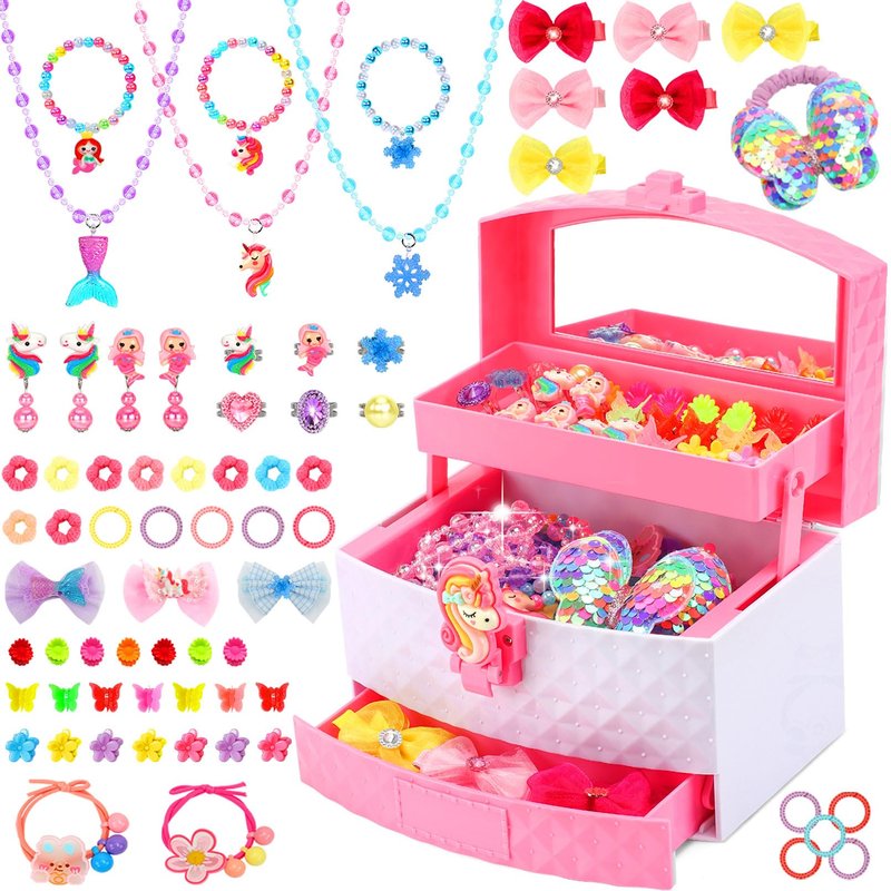 - EASY TO USE JEWELRY TOYS FOR GIRLS: The princess jewelry come in a very cute pink box for long-term storage and everyday use. There's also a great jewelry box organizer to put everything, with a easy to open unicorn button to protect all the accessories