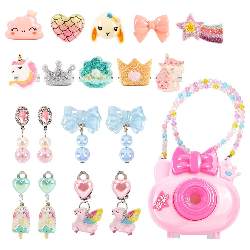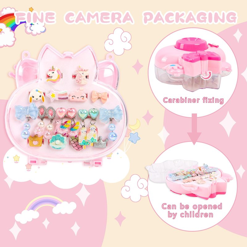 This camera style little girl jewelry features 10 adjustable kids rings and 4 pairs of clip on earrings for girls ,toddler princess dress up.
