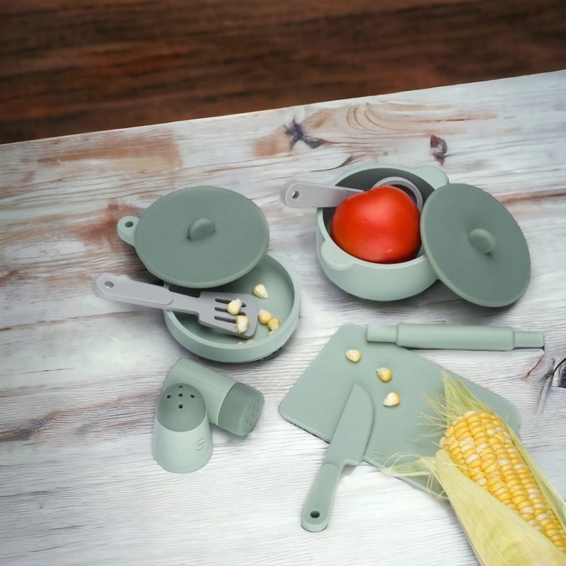 Kids Kitchen Silicone Pretend Toys- 9pcs Play Kitchen Accessories Set with Cookware -Food Grade Silicone -Kids Toy Kitchen Accessories – Pretend Play Kitchen Toy Set for Cooking-Green