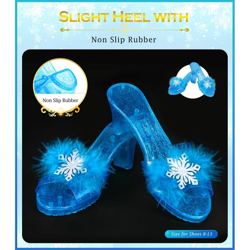 - 14PCS Kids Makeup Kit for Girls of Decent Quality: Kids makeup kit for girl includes hairbrush*1, makeup brush*5, eyeshadow*1, lipstick*1, mascara*1, powder*1, blush*1, nail polish*2, powder puff*1. Beautiful and very sturdy will definitely last a toddlers rough play. Toddler princess dress up shoes are not high with tiny grip pieces on the bottom, easy for little girl to walk in.