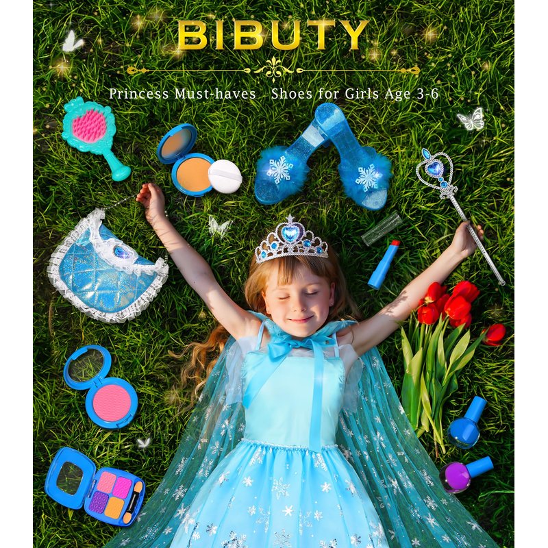 - Princess Dress Up Set for 3-6 Little Girls: Does your little girl have plenty of kids pretend play makeup set, but need all the fun princess accessories, especially the princess dress for girls. BIBUTY kids makeup kit, a hit for imaginative play time with 1 set of princess dress with cape, princess crown tiara for little girls, 1* princess dress up shoes, 1* handbag, 1 set of fake pretend makeup kit.