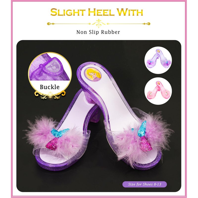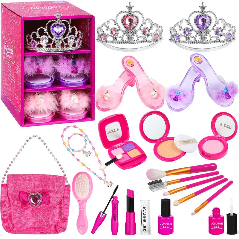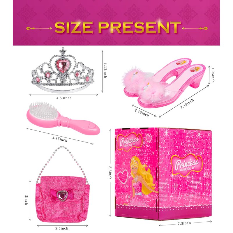 • A Cute Set for All Princess: Super cute princess accessory dress up set to suit most of the princesses. Toy makeup set with 2 sets of PURPLE and PINK matching princess shoes and crowns, 1* princess necklace & bracelet, princess play shoes set come in a nicely decorated box, delicate girl toys as gifts for toddle little girls who is really into princess items, ha ha!
