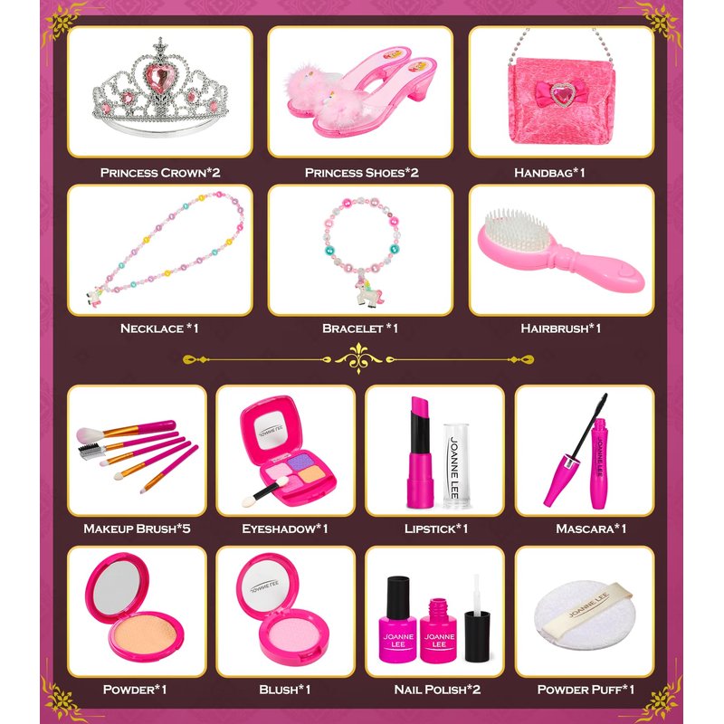 • 14pcs Kids Makeup Kit for Girls of Decent Quality: Kids makeup kit for girl includes hairbrush*1, makeup brush*5, eyeshadow*1, lipstick*1, mascara*1, powder*1, blush*1, nail polish*2, powder puff*1. Beautiful and very sturdy will definitely last a toddlers rough play. Toddler princess dress up shoes are not high with tiny grip pieces on the bottom, easy for little girl to walk in.