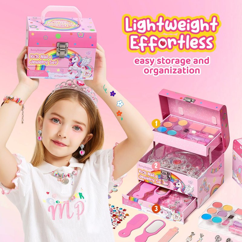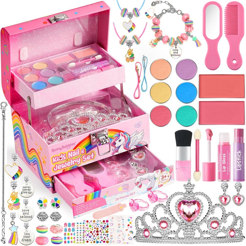 - Kids Makeup Kit Jewelry Box: This playful makeup kit includes everything a little princess needs, featuring safe & washable cosmetics, a handle mirror, and a range of fun colors. Let kids explore their creativity and style, transforming into their own version of a princess!