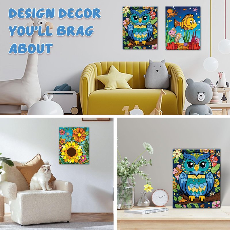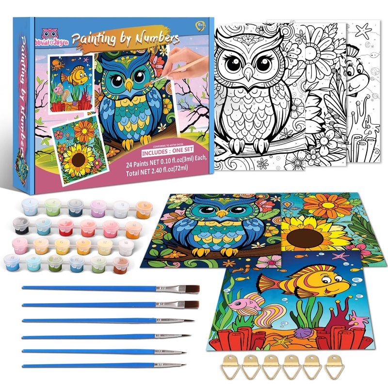 Unleash Your Child's Inner Artist with Our Exclusive Paint by Numbers Kit for Kids! Our Paint by Numbers Kit for Kids is the ultimate blend of fun, learning, and creativity, designed to captivate young minds and foster a love for art. Whether you have a tiny Picasso at home or a budding Da Vinci, this kit promises endless hours of artistic exploration and joy. Crafted with care, our kit features three mesmerizing canvases showcasing adorable animals—clownfish, owls, and a burst of vibrant flowers—that appeal to kids of all ages, especially tailored for those in the 4-8 and 8-12 age brackets. Each canvas comes to life on a sturdy frame, ensuring a smooth painting experience from the first touch of the brush to the last stroke of brilliance. Why Our Paint by Numbers Kit Shines Brighter: 24 Lively Acrylic Paint Pots: Enough to fill each canvas with rich, vibrant hues that don't fade or peel, our non-toxic paints are safe and plentiful, promising a masterpiece that shines. 6 High-Quality Brushes: Tailored for tiny hands, our brushes glide effortlessly across the canvas, making even the most intricate details a joy to paint. Crystal Clear Guidance: With clear numbering and color-coding, every child can confidently match each paint to its designated space, ensuring a dazzling finish every time. A Sip and Paint Experience for the Young: Perfect for those lazy afternoons, birthday bashes, or family craft nights, our Paint by Numbers Kit transforms any day into a fiesta of colors and giggles. It's not just a paint kit; it's a ticket to creating memories that last a lifetime. Gift-Ready Packaging That Wows: Encased in a beautifully designed box that's as enchanting as the paintings inside, our kit is the perfect gift for any occasion. Watch your child's face light up with excitement as they unwrap their new favorite pastime!