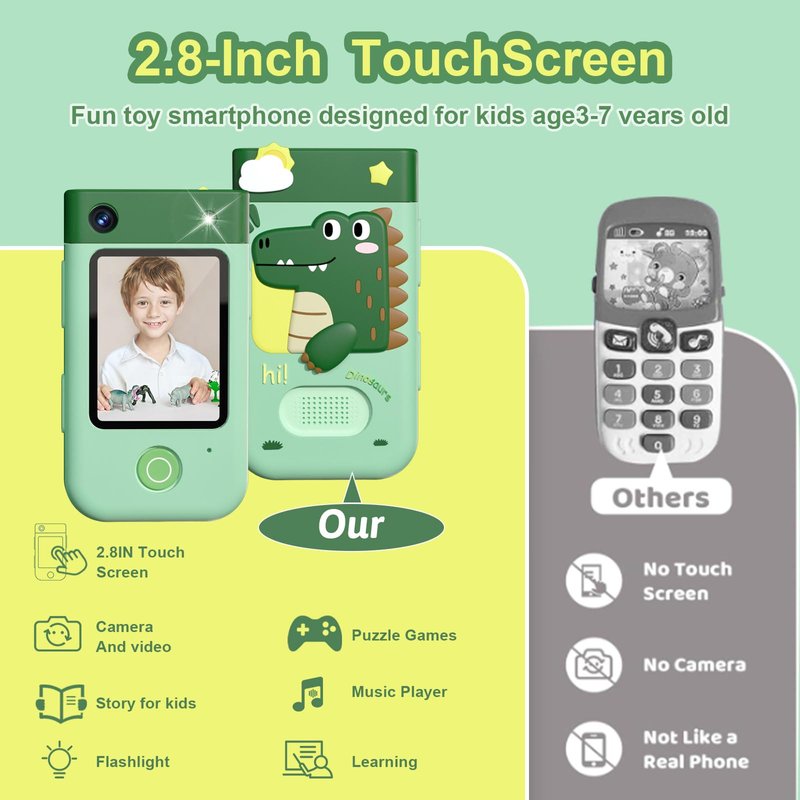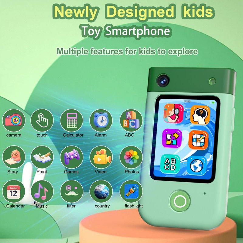 - [Multi-functional Kids Toy Phone] Touchscreen kids phone rich features, easy to use. Wide range of entertainment and learning options, such as puzzle games, music, ABC learning themes,story etc, and equipped with useful gadgets that children need, such as recorder, calculator, calendar, alarm clock, torch, etc. Kids toy cell phones, all in entertainment and learning, are designed for kids aged 3-12 years old.