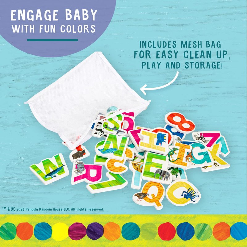 - Developmental Toy: 36 letters and numbers designed with the characters and art style from Eric Carle. Store easily in the mesh bag that suctions to the wall