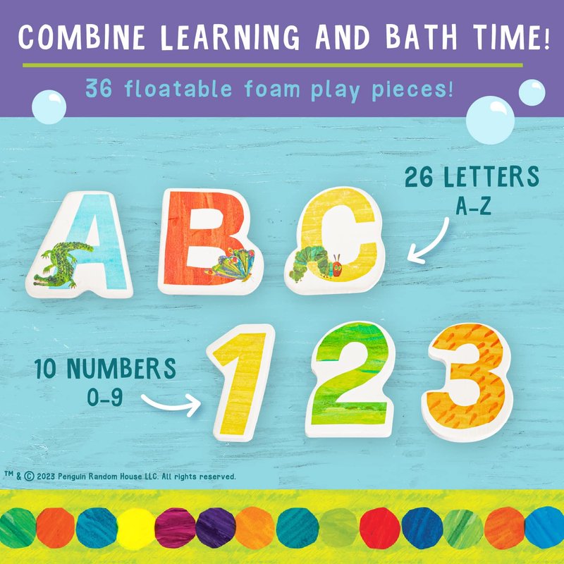 - Bath Time Splash: 36 piece set with full alphabet letters and numbers 1-9 bath toy for bath time play and goes great with other Eric Carle toys and toddler bath toys