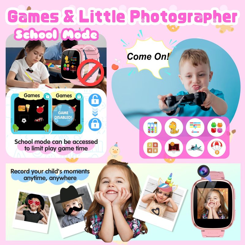 - Games Pedometer Alarm CEXCLUSIVE DESIGN: This watch not only has the basic functions of children's smartwatches on the market, but also becomes as smart as the parents' watches, with a full range of functions such as photo, music, games, alarms and so on. Needless to say, and also has a storybook, time teacher, sound teacher, habit alarm clock, camera stickers, pedometer, multi wallpaper, multi-language and moreamera Music Player Learning Card