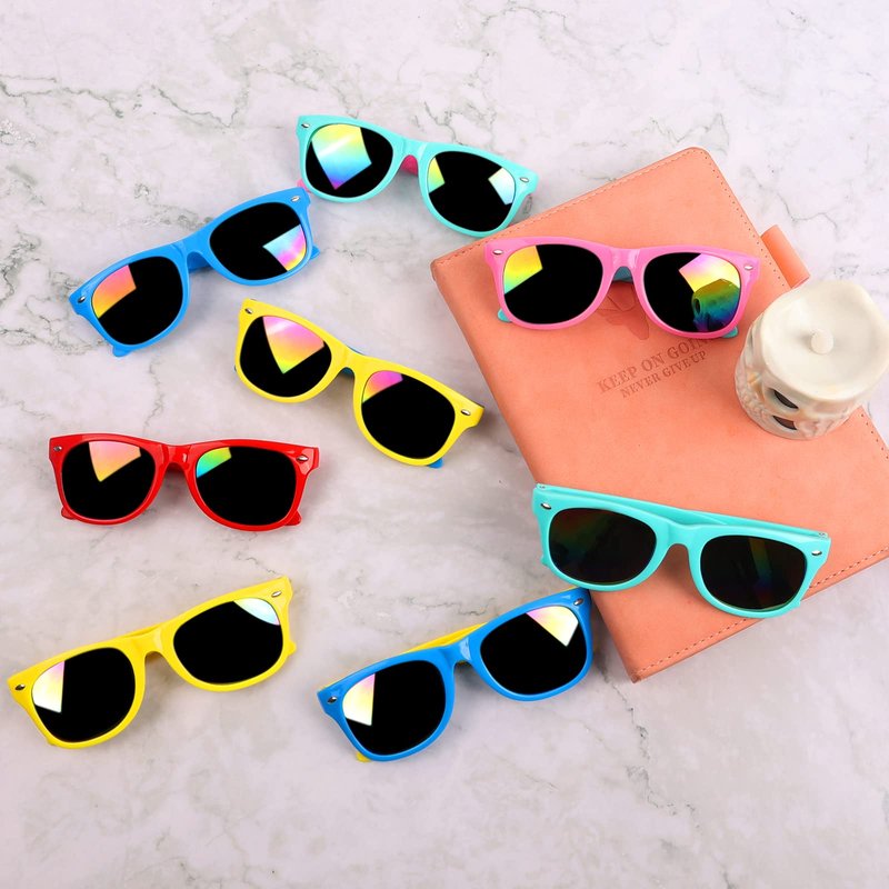 - 🌈Light Up The Summer Party with Colorful Party Supplies: Our kids' sunglasses bulk design combines Vintage 80's Retro horned rimmed and 8 neon colors matching. The bright colors look super cool, stylish, and attractive. With these gorgeous sunglasses party favors, it will make your little one the most eye-catching one. Just colorful the summer party in an easy way!