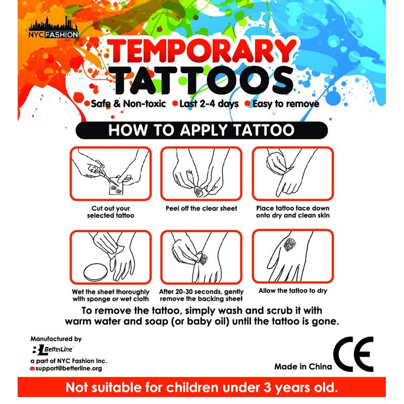 - 🎉 EASY TO USE: It takes less than a minute to apply temporary tattoos anywhere on the body. Just cut out the design from the tattoo, peel off the clear plastic film, place the sheet on skin, dampen with wet cloth and wait a few seconds for it to dry. These tattoos typically last about three days and they are waterproof. You can clean them with oil or scrubbing in the shower.