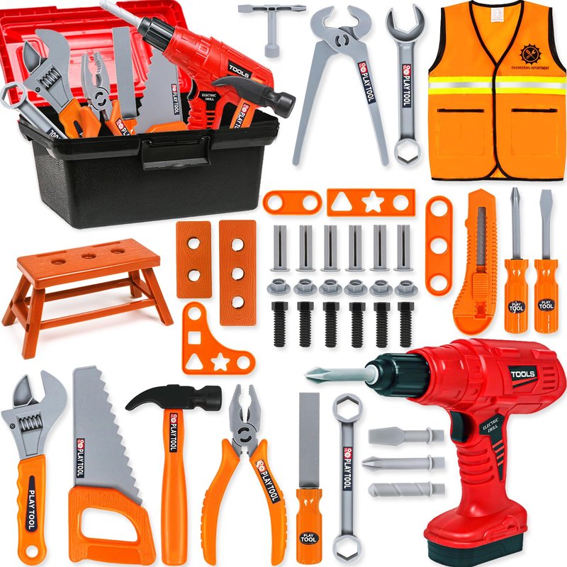 - 【Value Kids Tool Set】50pcs toddler construction toys set includes everything you need in the kids tool box like daddy's toolkit. Our toddler tool set includes handled toolbox, electronic kids drill with 3 replaceable drill bits, hammer, screwdriver, wrench, construction suit and various other tools and accessories, super functional and realistic. kids will fully enjoy these pretend play toys. Attractive toddler boy toys for ages 3-5 5-7.