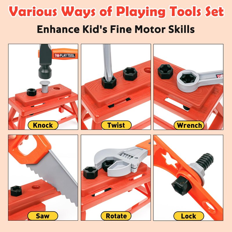 2. There are some small screw parts in the kids tool set. To avoid choking hazards, please accompany your child to play with these tools toys.