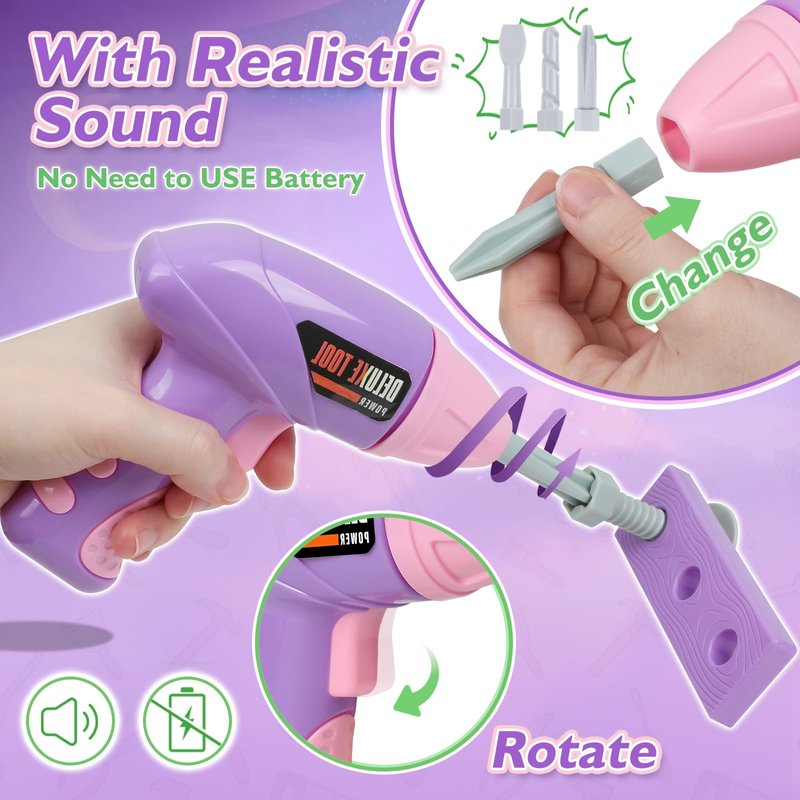 - Realistic Tool Functions: The kids tool kit includes a pretend drill toy that simulates sound and movement rotation when pressing the button (No battery needed). With simulation kids tools, children will learn how to use tools and develop fine motor skills.