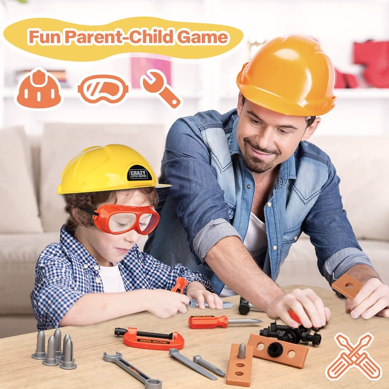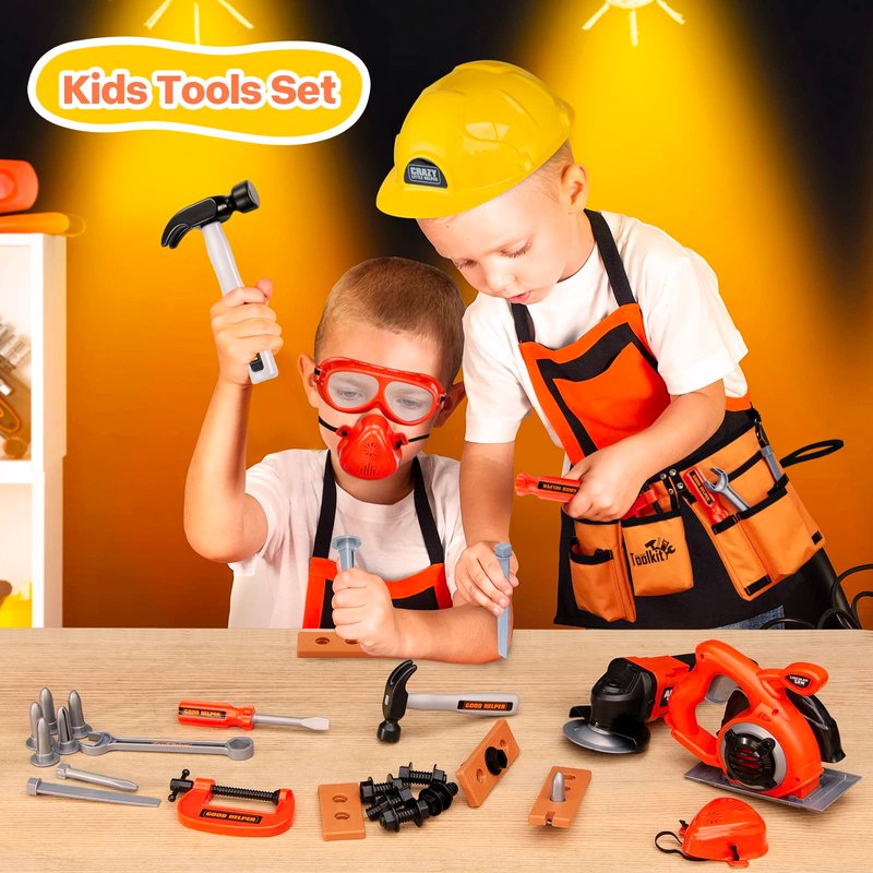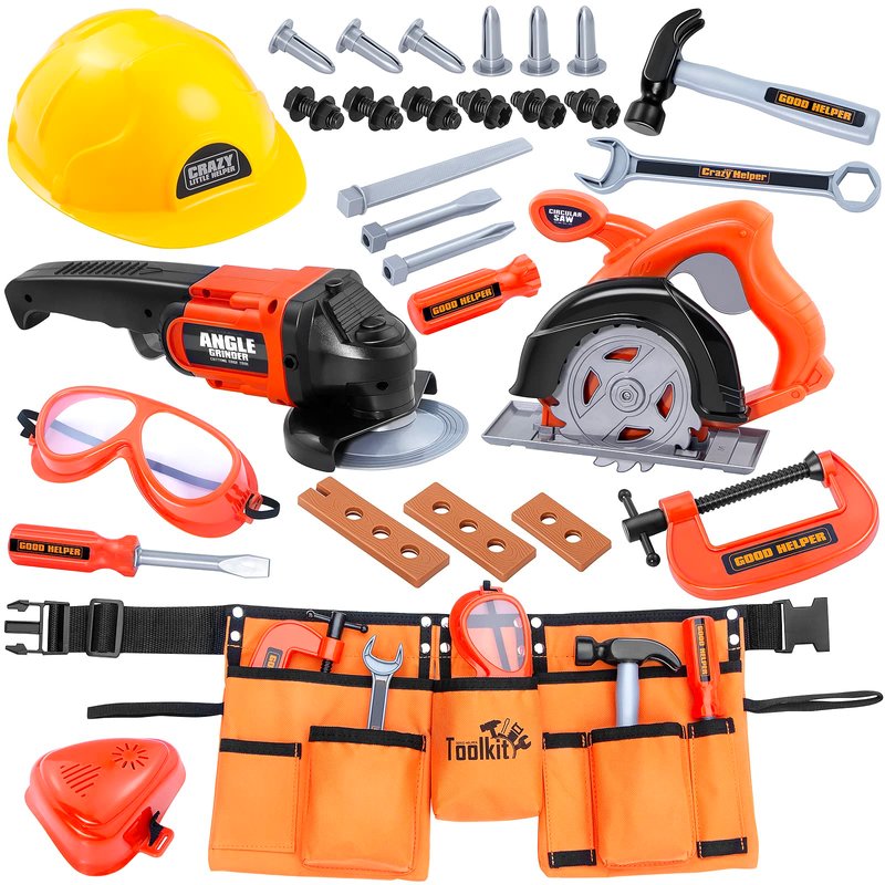 - New Version 34pcs Kids Tool Set: To introduce more daily use tools to the kids, we develop a new version of child tool set to our pretend play toy tool set family! Our Unique Construction tools for kids includes angle grinder, circular saw, googles, respirator, C clamp, safety cap, hammer, screwdrivers, and a variety of wooden pieces, nails, nuts and more! Everything is fully functional and realistic.