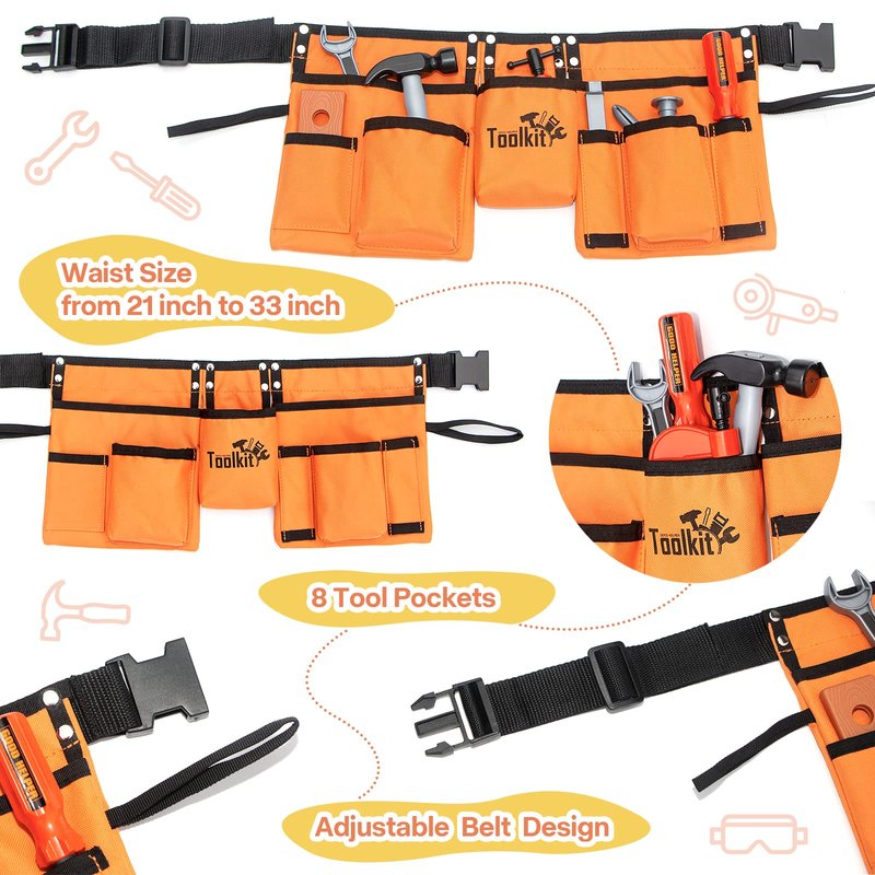 - High-Quality Big Range Adjustable Kids Tool Belt For Easy Storage: Made of high quality Oxford Fabric, our kids tool belt with 8 pockets create plenty of space for tools, adjustable belt is suitable for waist 21 inch to 33 inch. The whole set tools could be placed into this toddler tool belt for easy storage