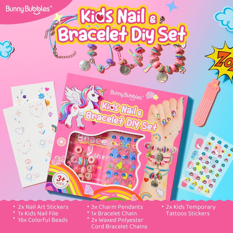 - Kids Bracelet for Girls: Included 1 piece of bracelet chain, 16 pieces of colorful beads, 3 pieces of charm pendants, 2 piece of waxed polyester,1 cord bracelet chains, 2 Pieces of nail stickers, 2 pieces of kids temporary tattoo stickers, 1 piece of kids nail file
