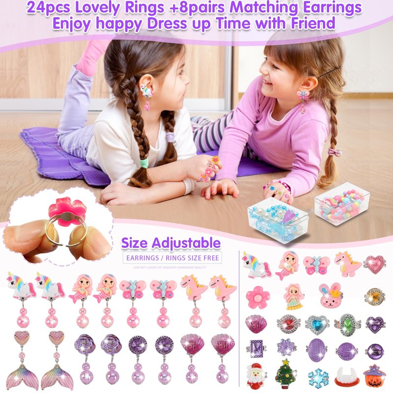 - Girls toys age 6-8 for Princess Dress Up and Pretend Play:Girls jewelry set toys for ages 5-7 are the perfect birthday Christmas gifts for any young jewelry enthusiast.Kids toys of Unicorn toys and mermaid toys can encourage your girl to recreate her favorite fairy tales and make their princess dreams come true. As our clip on earrings are pain-free and rings are adjustable, these toddler toys suitable for girls of all ages. Girls can dress up as a princess, unicorn toys for girls age 4-6
