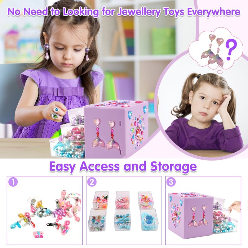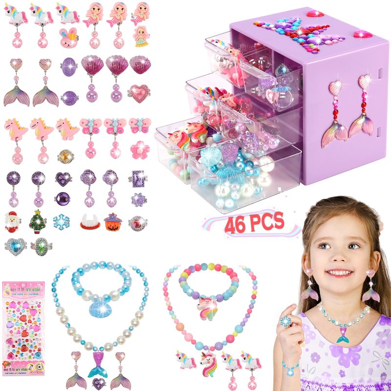 - Amazing Mess-free & Easy to Store jewelry organizer Box: Toys for ages 5-7 girls come in a purple jewelry box with 6 drawers box, easy to store, perfect toys for girls age 3 4 5 6 7 8 9 10 to having a good storage habit after pretend play. Girls toys age 6-8 have a brilliant DIY gem diamond sticker, girls can stickers to bling out their own unique jewelry box. Kids toys for girls include unique designed clip on earrings, necklaces, bracelets, rings, offer hours of entertainment
