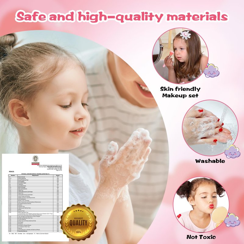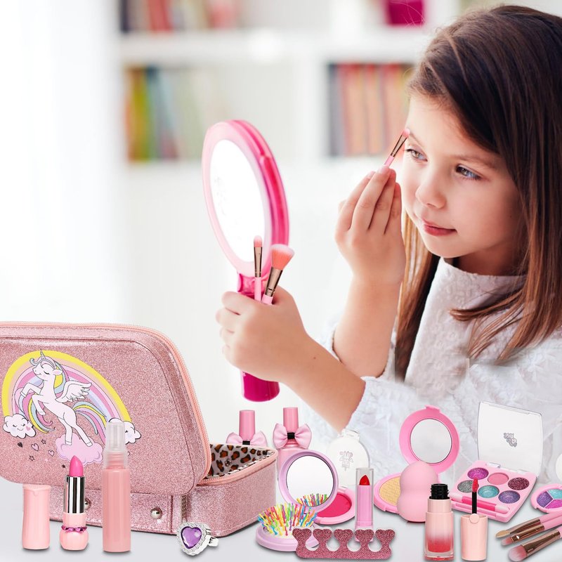 Safe And Washable Girls Makeup Toys:Girls makeup kit for kids are made from child-safe materials, It can be washed off with soap and water.colors is very bright and easy to apply.This kids makeup is dermatologically tested on kids ,it not contain any allergens/irritants.