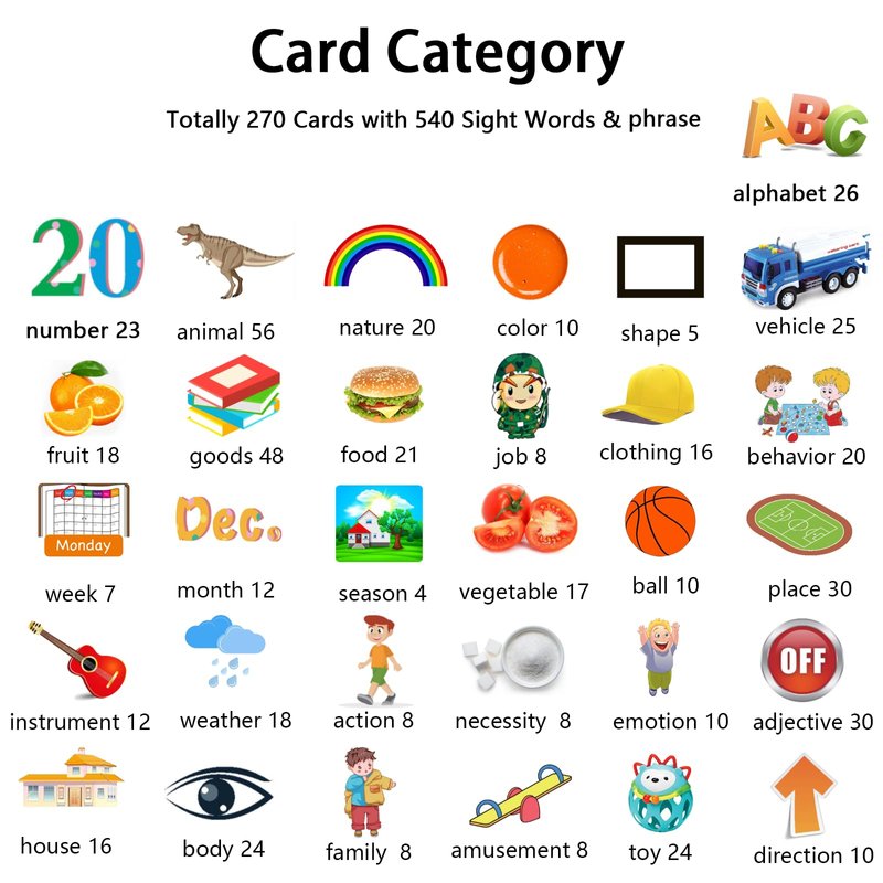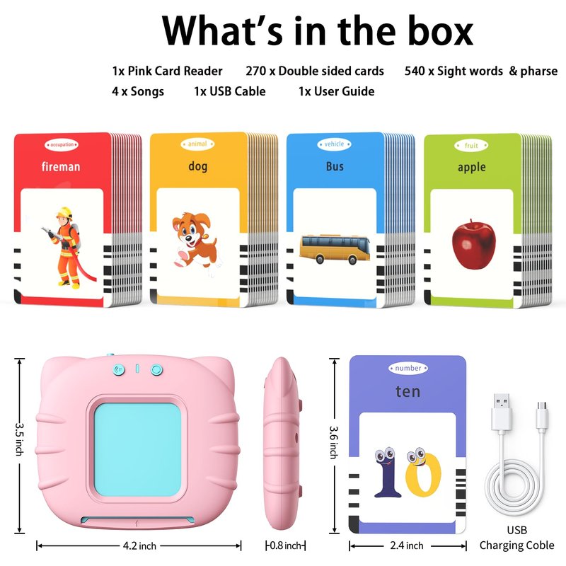 - 【The Package of this 540 words set】 A rechargeable card reader machine, a User Guide, and a USB charging cable, 270Pcs Children’s Double-Sided Cards with 540 words. Include subject: ABC Letters, Numbers 0-20, phrase, animals, color, shapes, vehicle, nature, week, month, season, vegetable, fruit, body, direction, job, food, daily necessity, family, clothing, toy, amusement, necessity, ball, instrument, weather, action, house, place, behavior, emotion, adjective.