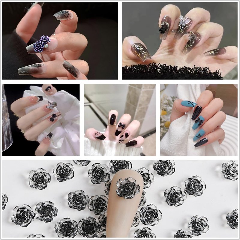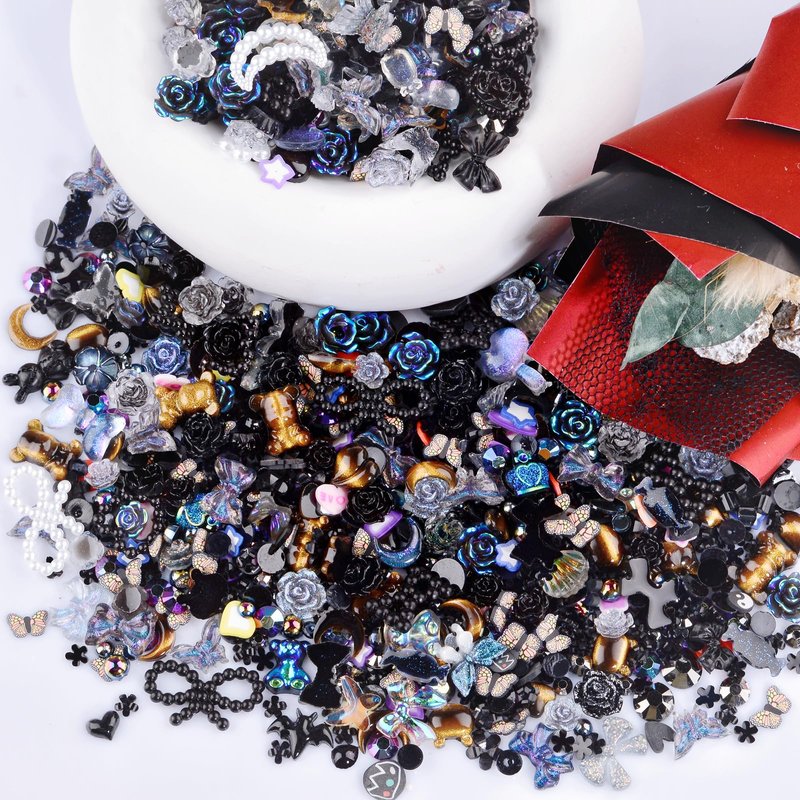 Kikonoke 850 Pieces 3D Butterfly Rose Flower Bow Rabbit Bear Nail Charms Kit with Nail Art Rhinestones Pearls Crystal Gems Nail Slices for Manicure DIY Crafts Jewelry Accessories (Black)