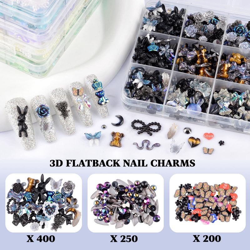 - ❤️Cute 3D Nail Art Accessories Set❤️ 1 pcs translucent box with 12 grids, 850 pcs acrylic nail charms. This nail kit contains more than 30 styles, sufficient quantity and styles can meet your different creative DIY demands.