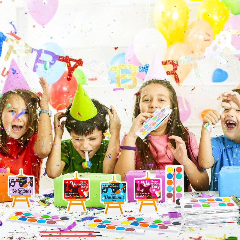 Valentine's Day Gifts Cards & Watercolor Paint Set Are you still worried about choosing gifts for your children? Our Valentine's Day cards set is very suitable for children and brings Joy to Many Occasions. This Valentines cards with watercolor paints will give lots of fun to your children! The watercolor paints set is a great way to improve children's color cognition and aesthetic appreciation. Easel Shapes Valentine's Day Cards--4 Designs: The patterns and greeting of these cards are all well printed, colorful and waterproof, which won't fade. Watercolor paint set is non-toxic, soluble in water, easy to clean, and safe for children. Perfect Gifts for Kids Party:Perfect for Valentine Day kids party, kids Valentines school activities,classroom exchange ,Valentine's party favors, birthday giveaways,game prizes,classroom prizes for students, kids valentines gifts,etc.