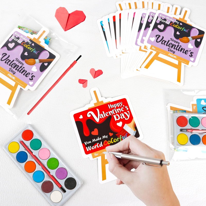 - Valentines Day Gifts Set: Package includes 24pcs easel shape Valentine's exchange cards in 4 different designs,24 pcs watercolor paint with 12 different colors and 25pcs transparent seal bags.Sufficient quantity will meet your different gift demands.